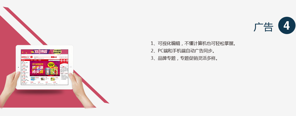 服务内容:电脑端、手机端。商品管理、会员管理、订单管理、门店管理、促销管理。